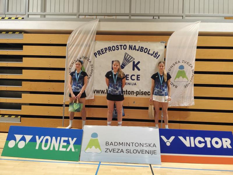 Pri dekletih je bil finale klubski dvoboj med Saro in Milo. Zmagala je Sara Bregar pred Milo Vrhovnik – obe iz Badminton kluba Mengeš. V tekmi za tretje mesto je brez boja slavila Zarja Žlebnik (BK Ljubljana).